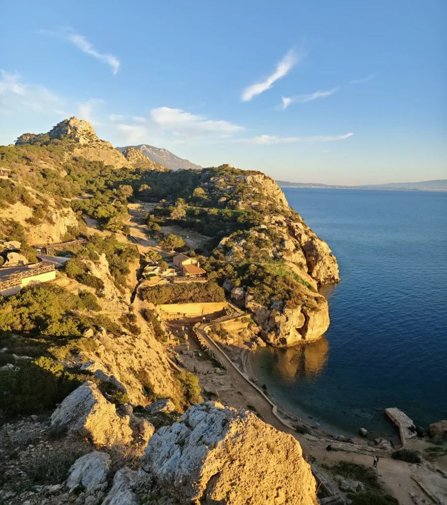 Με το ποδήλατο βγαίνουμε από την πόλη και στην Ποσειδωνία περνάμε τη Διώρυγα από τη βυθιζόμενη γέφυρα. Περνάμε το Λουτράκι, τις ιαματικές πηγές, συνεχίζουμε επί της παραλιακής μέχρι τη λιμνοθάλασσα της Βουλιαγμένης και λίγο πρίν το ακρωτήριο επισκεπτόμαστε τον αρχαιολογικό χώρο στη Ηραίο.